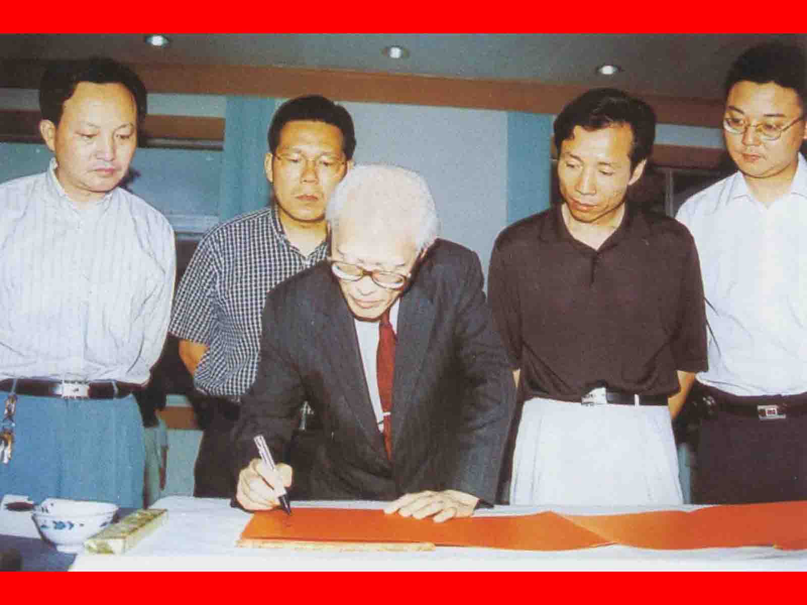 2002年8月15號下午,臺灣著名詩人余光中,參加完w66國際相思節活動后,來到w66國際集團參觀時,為七夕w66國際相思節提字:《一66國際,千年因緣》。