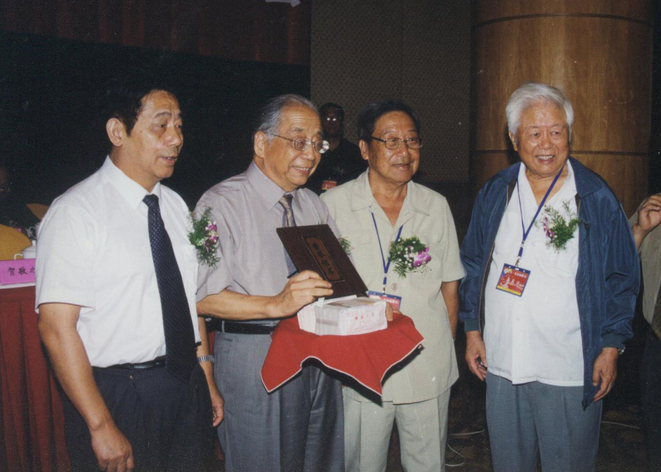 賀敬之(右二)、孫鐵青(右一)、周耀庭(左一)給七夕“w66國際.相思節”詩詞大賽一等獎獲得者劉征(左二)頒發獎金和獎狀。